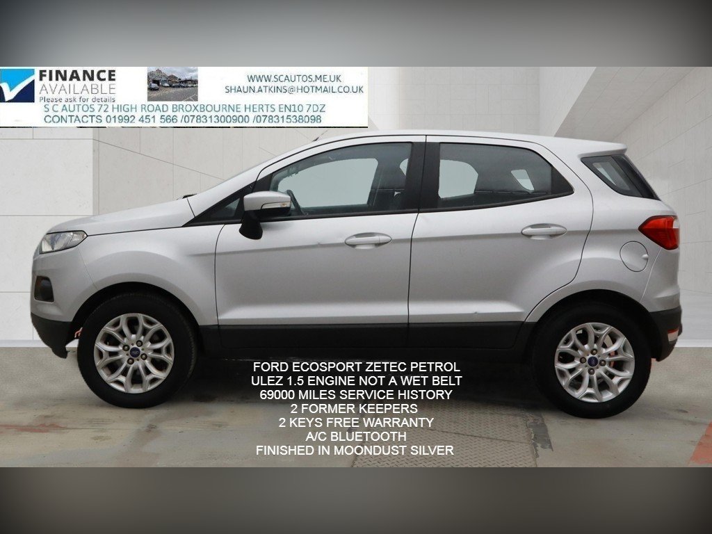 For sale is a 2015 Ford Ecosport 1.5 Zetec SUV with a petrol engine and manual transmission, boasting 69000 miles on its Euro 5 (112 ps) motor. This 5-door, 5-seat vehicle is ULEZ compliant and comes with a valid MOT until 01/05/2026. Ideal for urban and off-road driving, this SUV is efficient and reliable, with ample space for passengers and cargo. As a petrol-powered vehicle, it offers a balance of power and economy, making it a versatile and practical choice for everyday use. Don't miss the opportunity to own this well-maintained, high-quality SUV. -